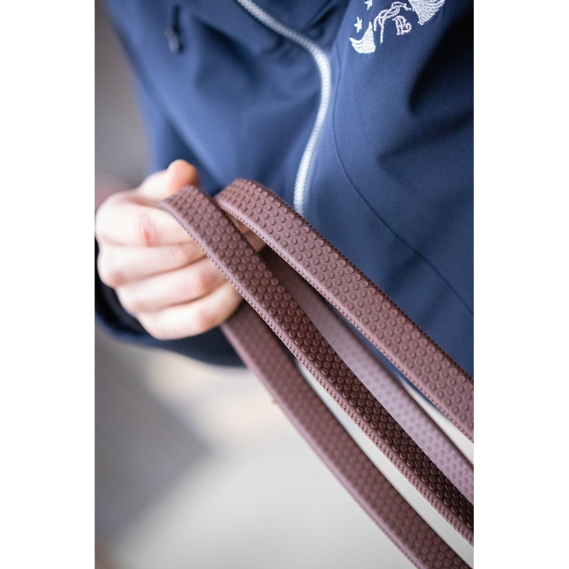These reins match the saddle-stitched bridle as a spare part. Rubber covered reins with leather martingale stops. They are supple for more comfort.