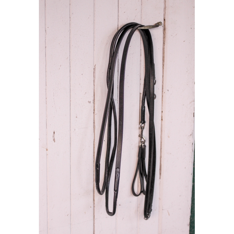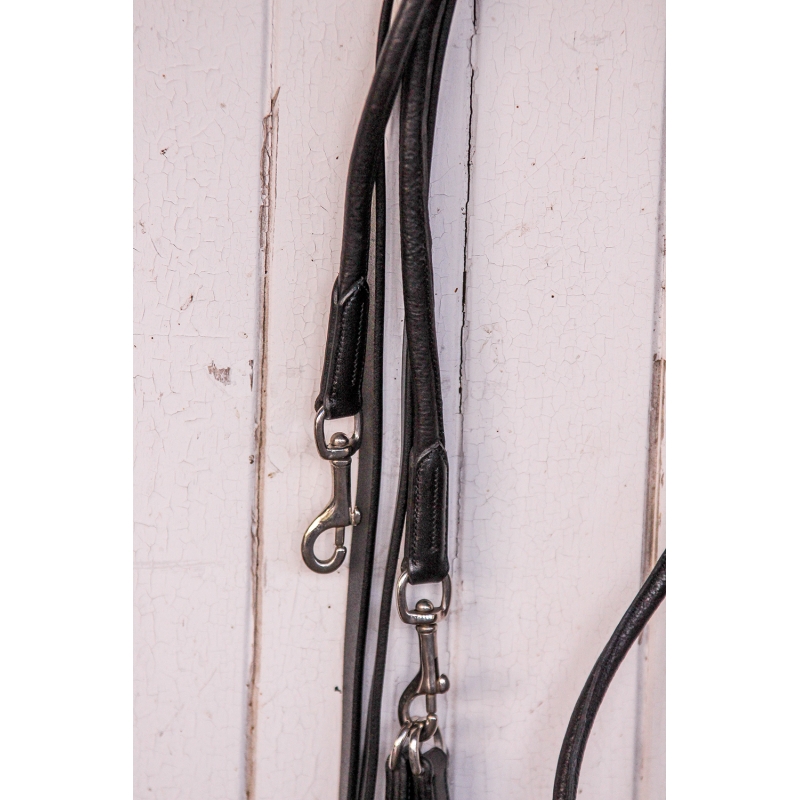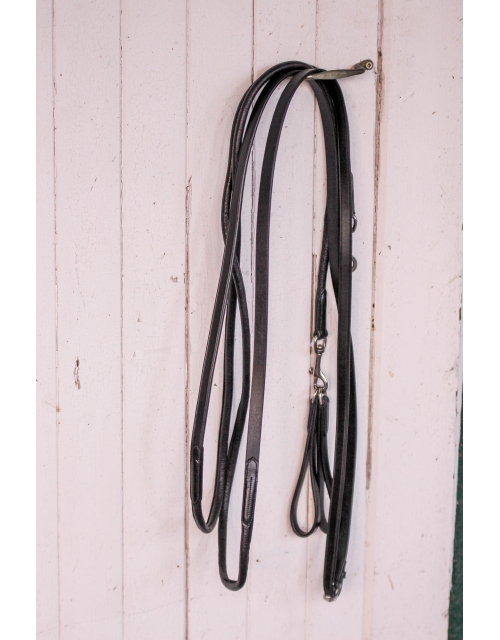 Draw reins complete the Pénélope leather range. Very practical and comfortable to use, the upper part is made of flat leather, for more comfort for the rider. The lower part is made of ultra supple round leather. They have a snap hook for each side with a strap attachment.