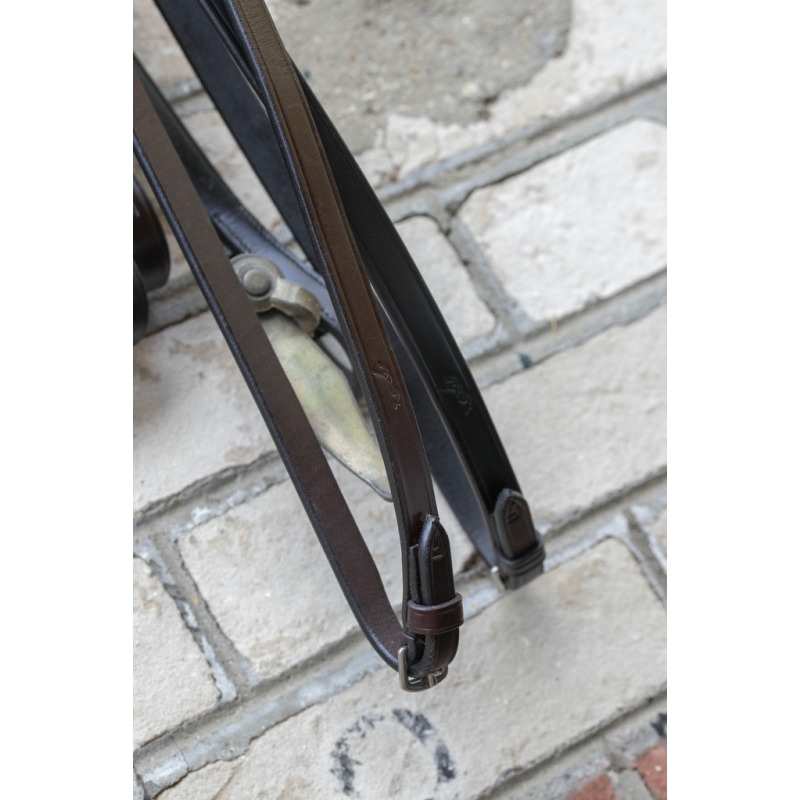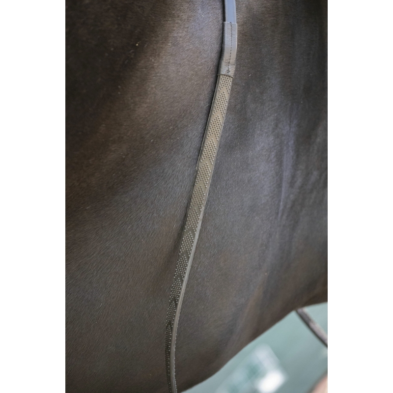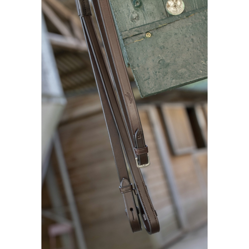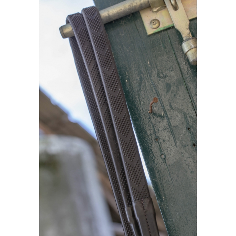 Matching set of reins for the Daily bridle, with a very souple rubber, and V shape grips. Penelope logo is printed in the top leather part. Buckles are matching the bridle's, silver color.