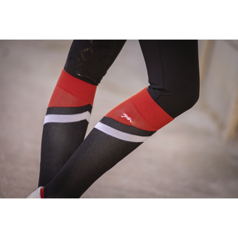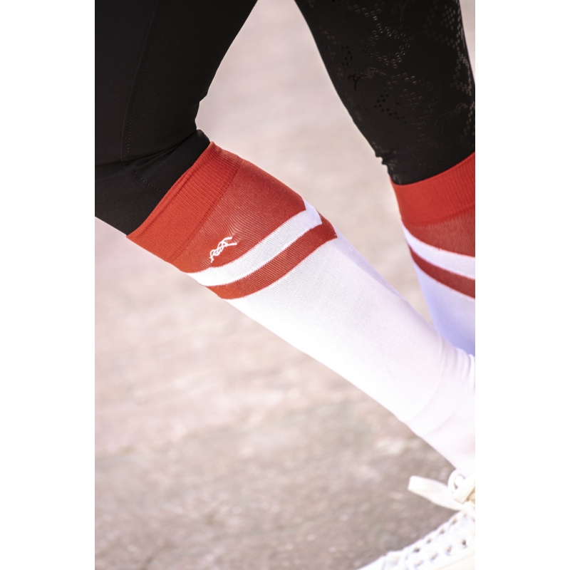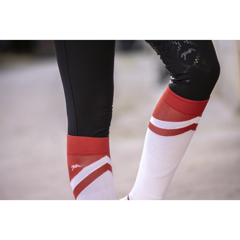 Fun Riding Socks sold in packs of 2. One pair is black and terracotta, and the other is white and terracotta, both adorned with cross lines. The Pénélope logo appears in small, white, on the outside of the calf.