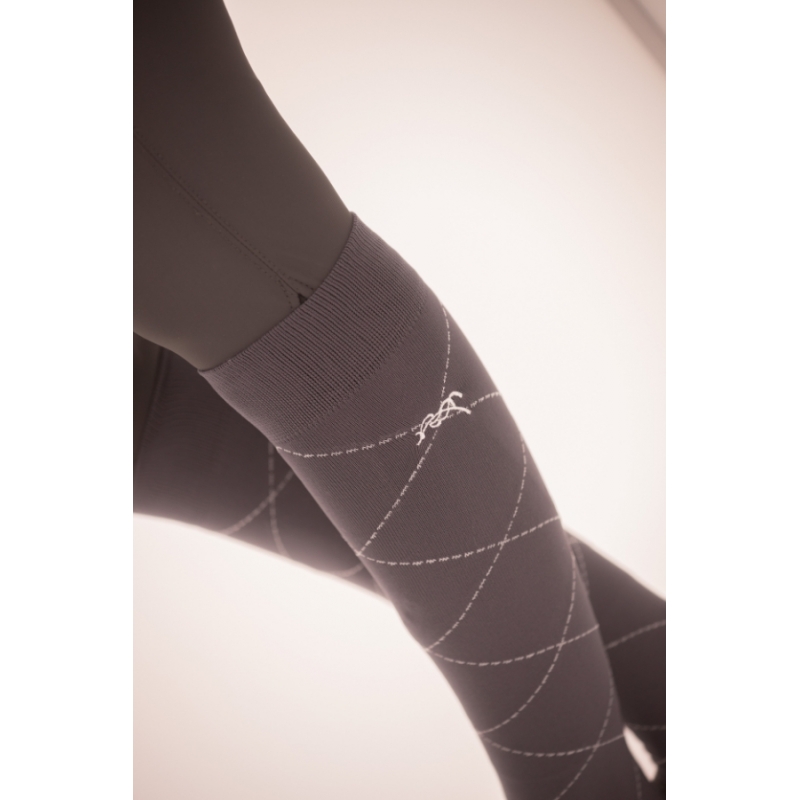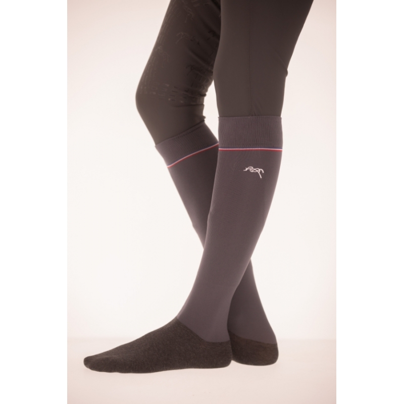 The softness of the colors and the extraordinary feel of our Luxe socks! It's a pleasure to slip them on every day over your riding breeches—you might even want to wear them just to stay cozy and warm at home! Of course, they are primarily made for horseback riding, perfect for daily use at the stables or during competitions! The set of two pairs of Pénélope Luxe socks includes one plain pair with three fine tricolor stripes at the top and a small Pénélope logo, and another pair with diamond stitching and a small Pénélope logo.