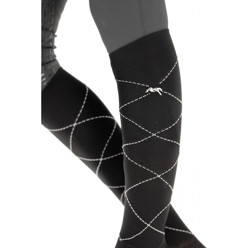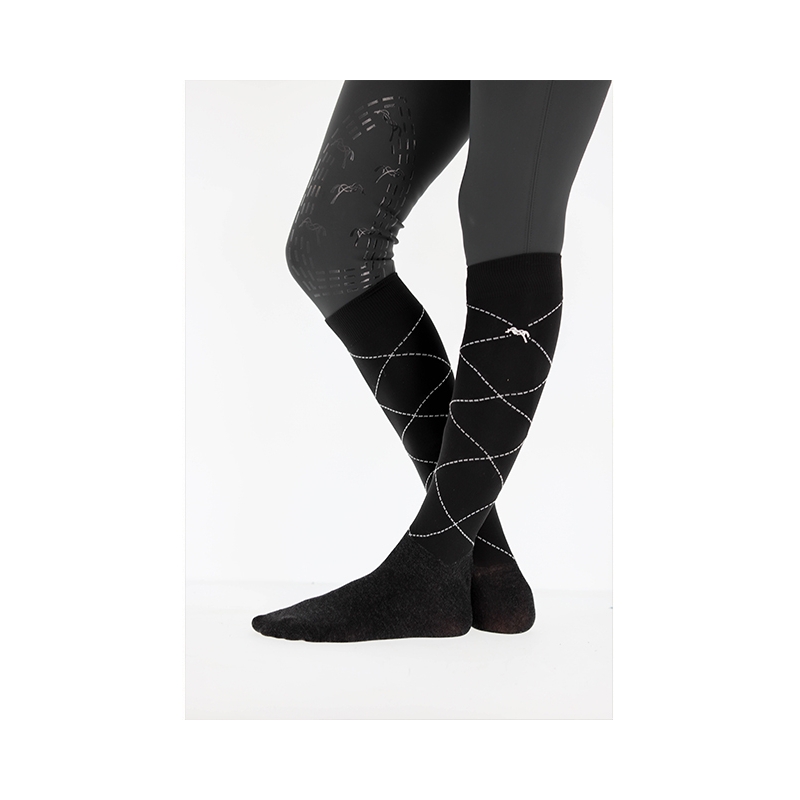 Two different designs in a set of two pairs of riding socks ! One pair has diamond shape stitching and the other has two thin white stripes in contrast on the upper calf. Breathable and stretchy, the luxe socks are easy to put on and stay on the leg.