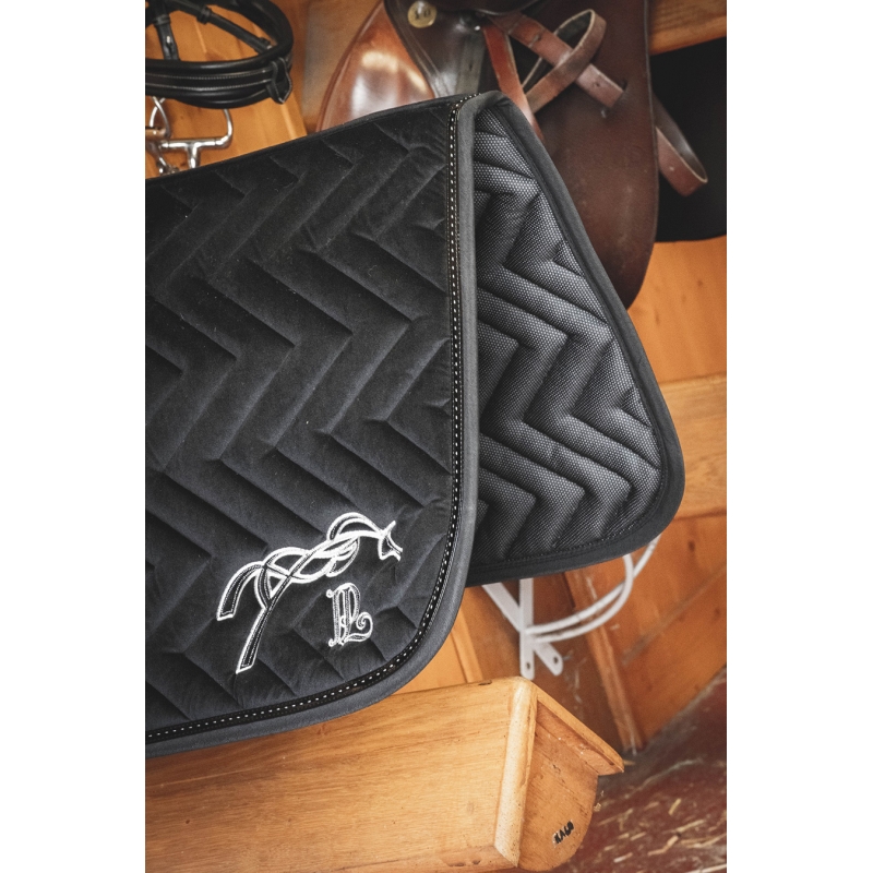 We keep our signature silhouette for this new saddle pad from the Pénélope Collections. This year, it is available in a very soft, elegant and vintage velvet fabric. The same shape, to free the wither as much as possible, a girth strap on each side for better stability and a comfortable black lining.