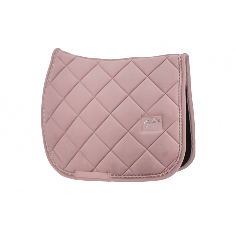 The New Strass Saddle Pad features a diamond quilting. Made from a velvet-effect fabric, it is adorned with a twisted cord and a row of rhinestones. The Pénélope logo is also made of rhinestones and is visible in a tone-on-tone rectangle on the back left of the pad. Thickly padded, its diamond quilting makes it very chic. Its spine is well relieved to free the withers, and it comes with a girth loop on each side for better stability under the saddle.
