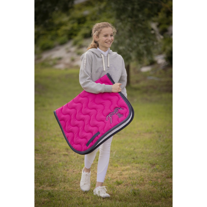 This saddle pad is adorned with a characteristic 'point sellier' trim from the Pénélope brand and features thick padding. Very comfortable for the horse, it has a honeycomb-like inner lining that allows air to circulate, absorbs, and prevents excess sweating. Its well-cut wither allows for easy placement. The shape of the pad fits perfectly to the horse's back. It also has two girth loops to keep it in place under the saddle. The PL logo is found on the left side of the pad.