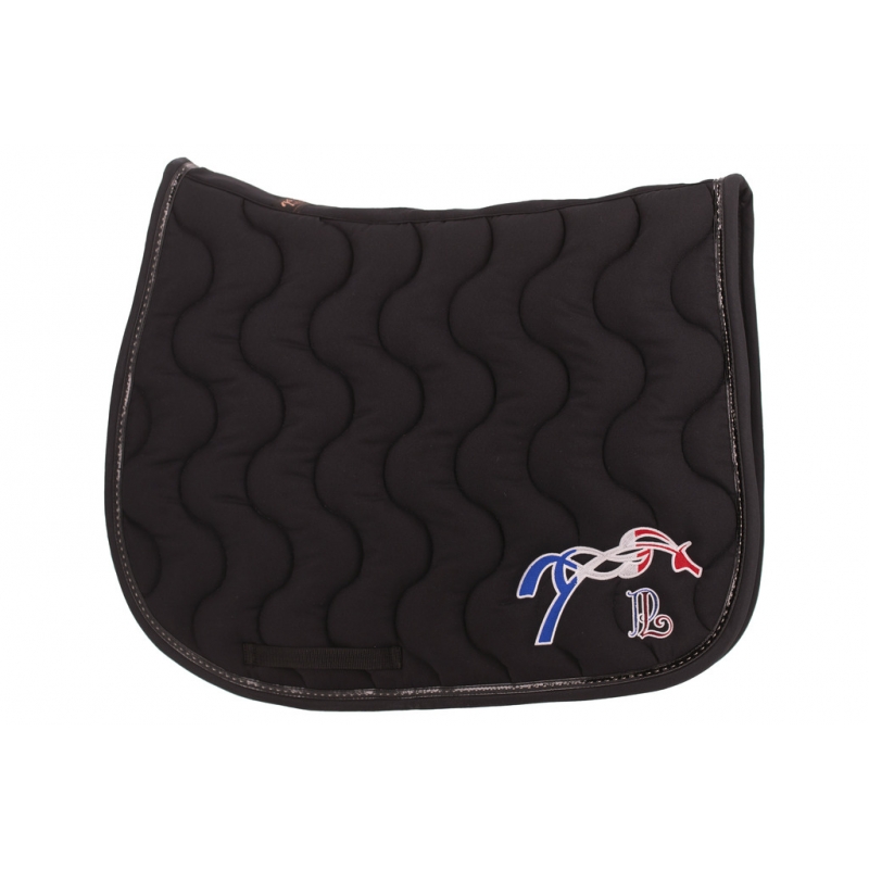 This saddle pad is adorned with a characteristic 'point sellier' trim from the Pénélope brand and features thick padding. Very comfortable for the horse, it has a honeycomb-like inner lining that allows air to circulate, absorbs, and prevents excess sweating. Its well-cut wither allows for easy placement and the shape of the pad fits perfectly to the horse's back. It also has two girth loops to keep it in place under the saddle. The PL logo is found on the left side of the pad.
