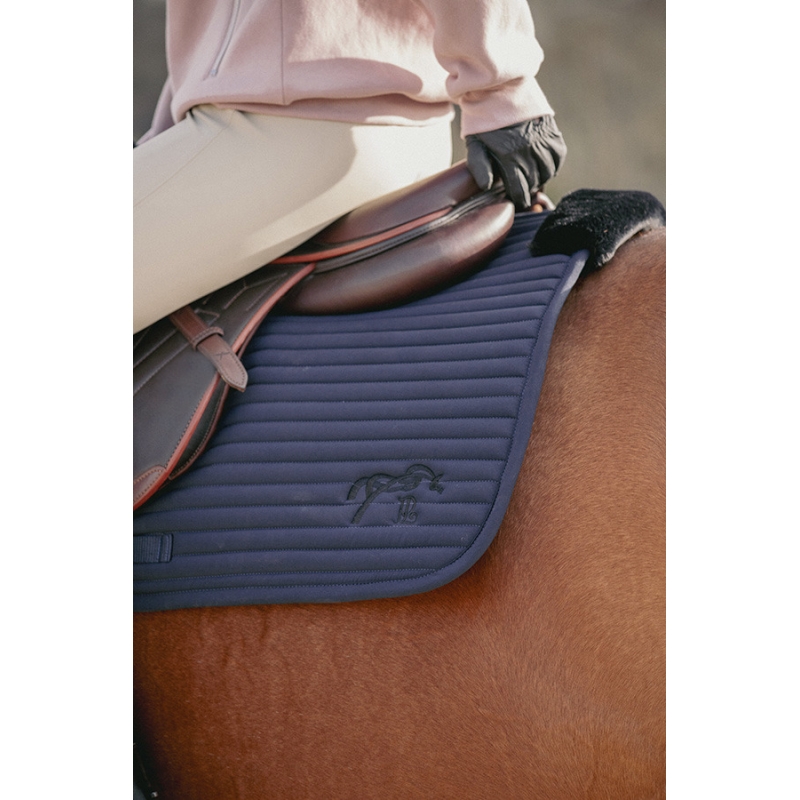 Saddle pad "Lyona" by Pénélope with fine horizontal quilting, featuring faux fur reinforcement under the saddle, at the withers, and at the back of the saddle. Its back line is well-designed to allow for proper wither clearance. Under the saddle, the faux fur reinforcement is very comfortable for the horse and acts as a cushioning element. The reinforcements at the front and back of the saddle ensure that the Lyona pad stays securely in place. This stability is enhanced by the presence of girth loops on each side. At the back on the left side, the Pénélope logo is tone-on-tone embroidered.