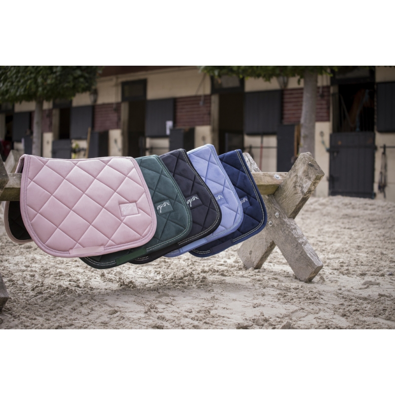 The New Strass Saddle Pad features a diamond quilting. Made from a velvet-effect fabric, it is adorned with a twisted cord and a row of rhinestones. The Pénélope logo is also made of rhinestones and is visible in a tone-on-tone rectangle on the back left of the pad. Thickly padded, its diamond quilting makes it very chic. Its spine is well relieved to free the withers, and it comes with a girth loop on each side for better stability under the saddle.