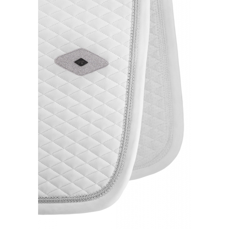 The Calisson dressage saddle pad features fine, comfortable horizontal diamond quilting. It is trimmed with a double row of rhinestones and includes a glitter diamond-shaped insert, inside which sits a tone-on-tone silver 3D Pénélope pin.
