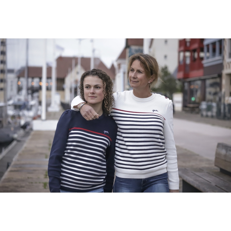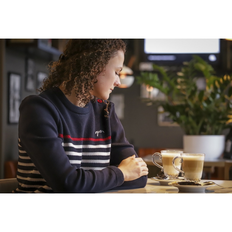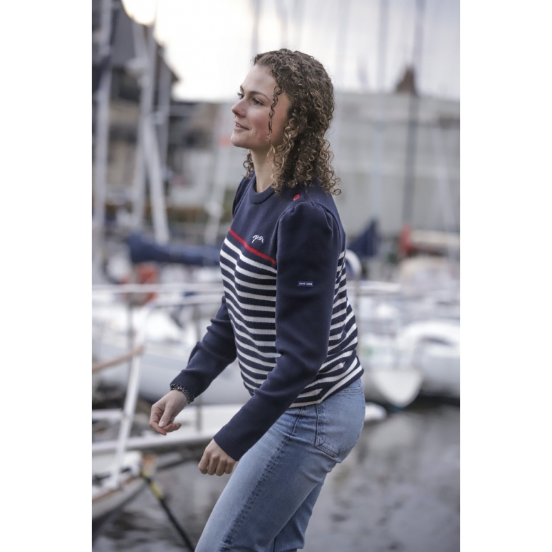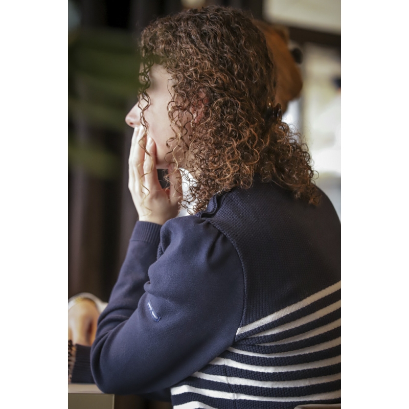 Pénélope "Maëlle" Pullover from the SAINT JAMES x Pénélope Collections collaboration. In the pure spirit of the sailor sweater, our Maëlle pullover is made of soft and lightweight honeycomb knit. On the left shoulder, like a true sailor sweater, it opens with three buttons: one navy, one white, one red, all three marked with the "PL" of the brand. Light gathering on the shoulders adds a feminine and refined touch. Finally, on the left sleeve, you'll find the SAINT JAMES logo, and on the heart, the small Pénélope logo.