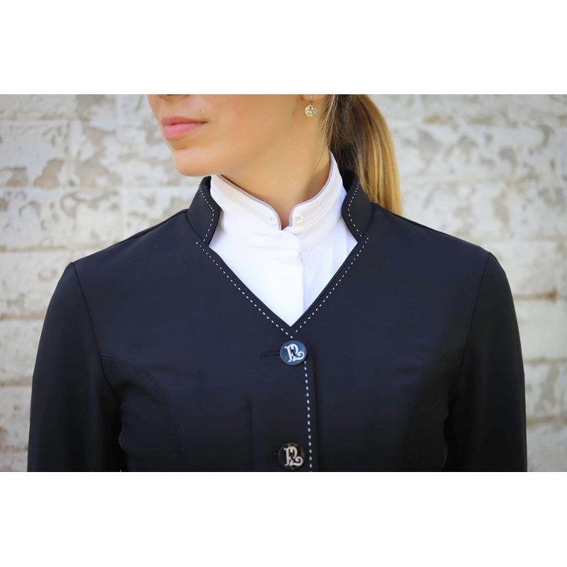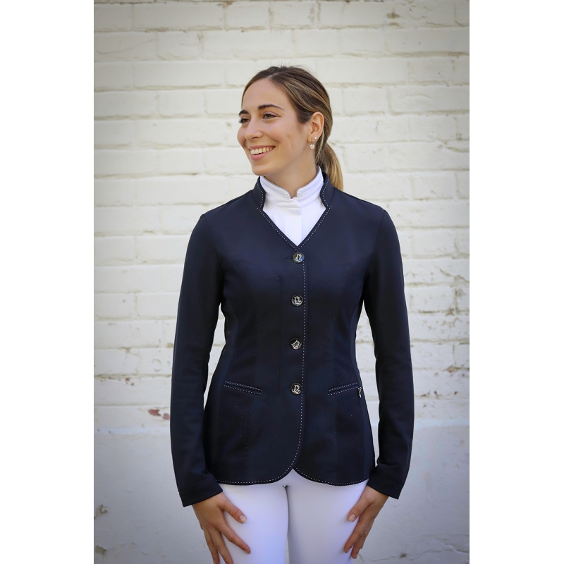 The Pénélope show jacket named New York has a new neckline cut. The fabric has technically changed and made of an ultra-elastic fabric for more comfort. In the back and front, decorative stripes in tone-on-tone fabric provide an additional elegance. This new model is the perfect combination of comfort and a new look, far from the traditionnal show jacket collar. The New York show jacket has four buttons and a zipper to close it and two decorative buttons on each cuff. These buttons are made of mother of pearl and have the PL monogram. Its cut, strictly identical to the iconic Point Sellier show jacket, draws the line of the back and the curve of the waist. Two flat slits are in the back for a total freedom of movement in the saddle.