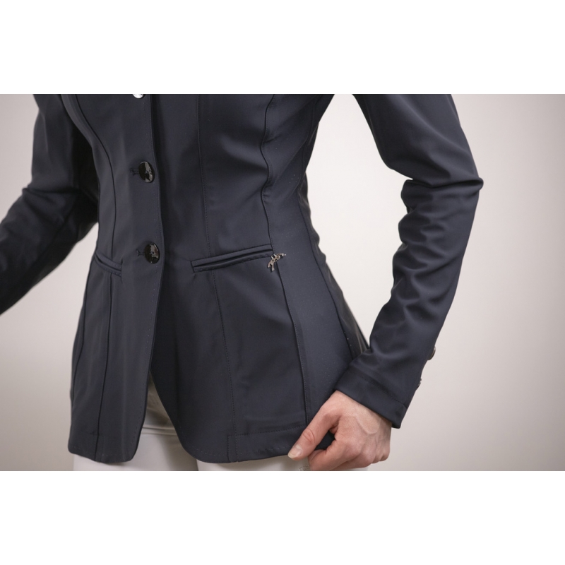 Calista Pénélope show jacket with a sober look, ideal for riding shows. It fits close to the body and is made from a very comfortable stretch fabric. It fastens with a zip hidden by three tone-on-tone buttons, and has two false pockets, one of which is embellished with a small silver Pénélope charm. At the bottom of the sleeves, there's a smaller, but still tonal, buttonhole. At the top of the left arm, a small Pénélope rhinestone perfectly finishes off this elegant yet highly technical show jacket.