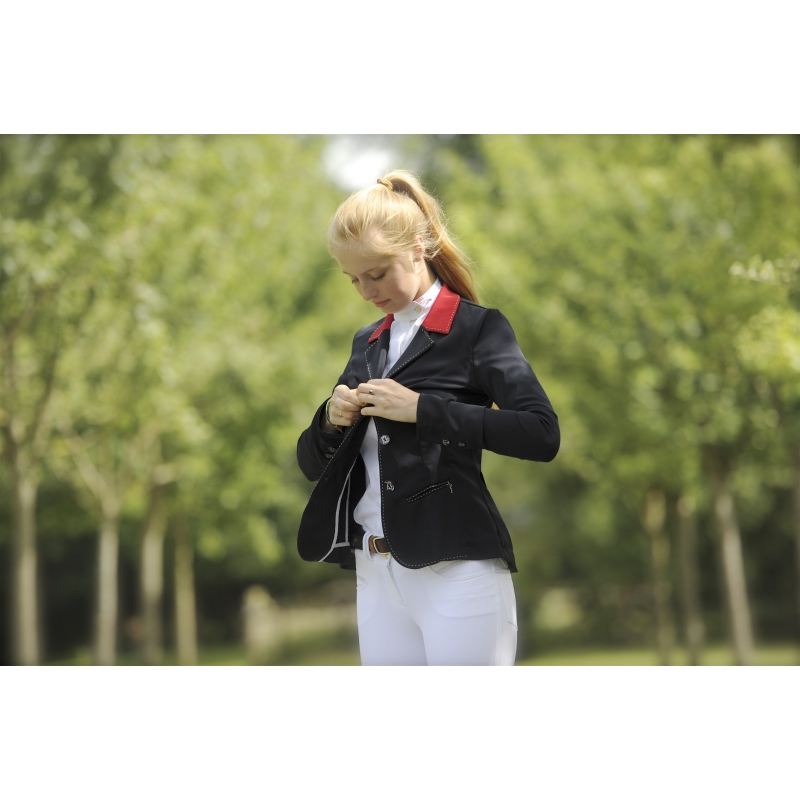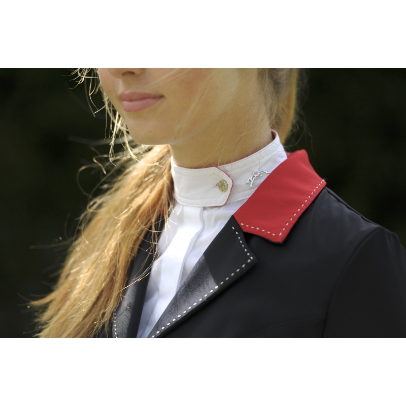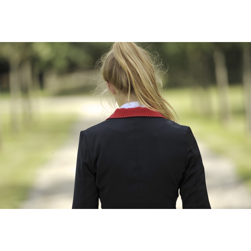 The competition jacket called Paris signed by Pénélope collections is one of the brand's flagship and emblematic products. Perfect for competitive riding with its slim fit and ultra-stretch fabric (Polyamide and Spandex). It is aesthetic and technical at the same time and suitable for many morphologies and all ages. An elegant saddle stitch is sewn along the buttons, on the collar and at the back of the arms. The back is well drawn and there are two slots to ensure the comfort of the rider on horse back. To close it, three pearly buttons on the front and two at each end of the sleeves to finish the look of this jacket.
