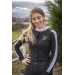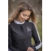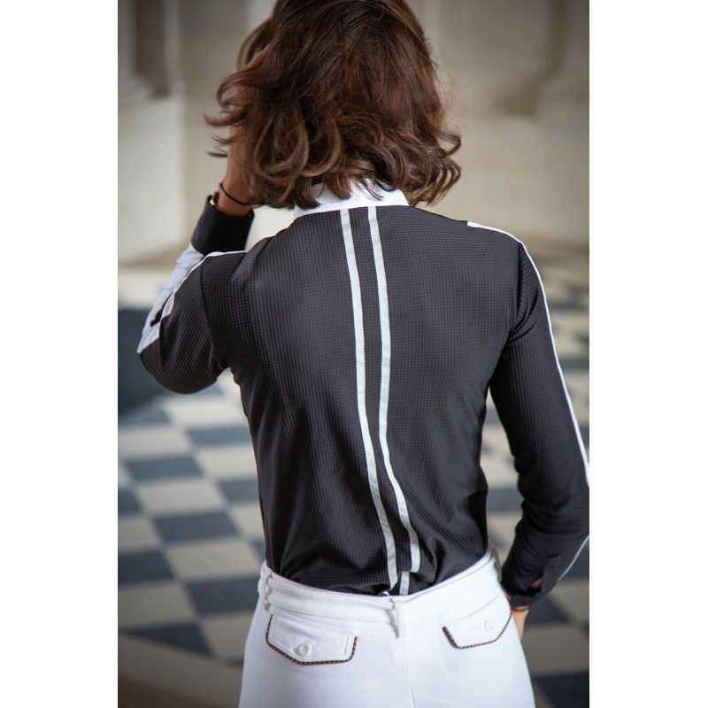 A long-sleeved competition shirt that will blend in under your show jacket or just on you! The soft, breathable honeycomb fabric fits close to the body and matches with your breeches. The Showshirt fastnens with snap buttons on the front, hidden by a pretty tab. On the shoulders and along the arms, there is a contrasting white stripe made of a micro-ventilated fabric that will make this shirt very breathable and comfortable to wear. In the back, two thin strips of white fabric bring an original look and draw perfectly the line of the back. Its stand up collar is slightly less high than usual and always enhanced with a small silver charm of Penelope logo.
