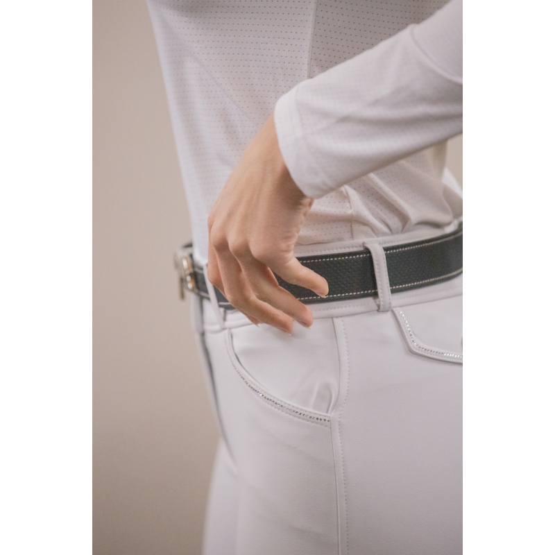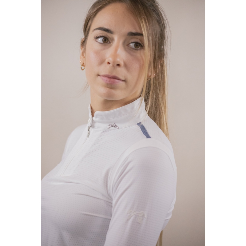 The Long Sleeve Séville Mesh Show Polo Shirt is crafted from white micro-perforated fabric, fluid, lightweight, and breathable. Very chic, its stand-up collar closes with a zip topped with a button. Well-fitted, its collar is adorned with a small silver logo charm. A blue-gray flat piping and a small white panel delicately outline the shoulder for a lovely silhouette. On the left sleeve, the Pénélope logo appears in a rubber-like material.