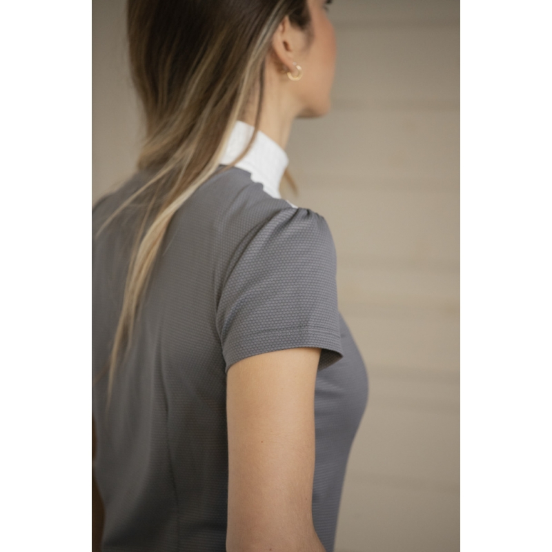 Las Honey short-sleeved show polo shirt made from a lightweight and breathable honeycomb fabric. With its beautifully designed plastron above the chest, it combines the elegance and technicality necessary for equestrian shows.