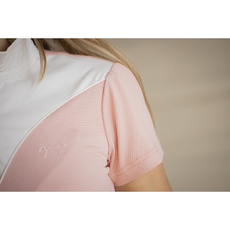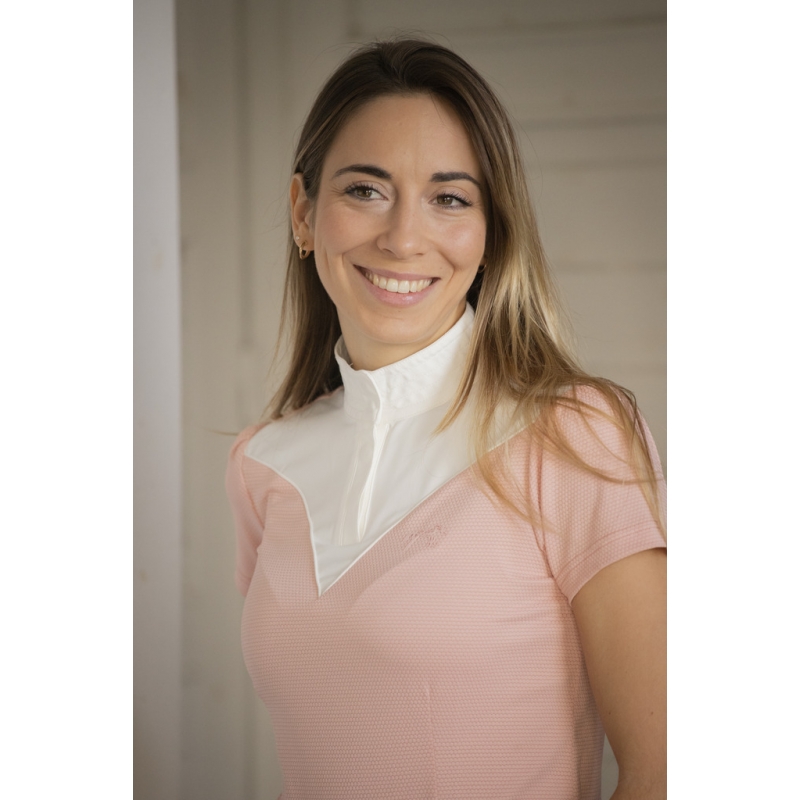 Las Honey short-sleeved show polo shirt made from a lightweight and breathable honeycomb fabric. With its beautifully designed plastron above the chest, it combines the elegance and technicality necessary for equestrian shows.