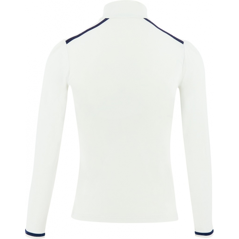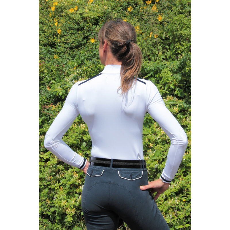 Bruges competition polo shirt is worn very close to the body with its slim fit in stretchy lycra. The end of the sleeves and the shoulders are decorated with a slightly shiny navy velvet braid. The collar is closed by three small discreet snaps. Two inserts in tone on tone decorate the elbows.