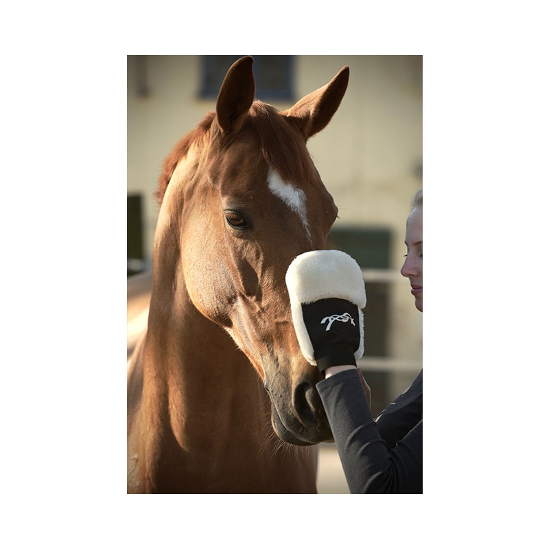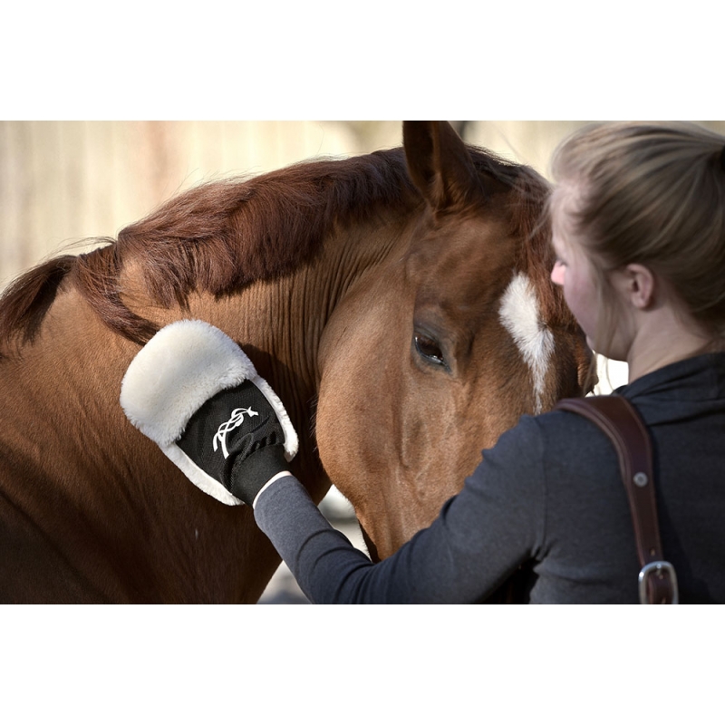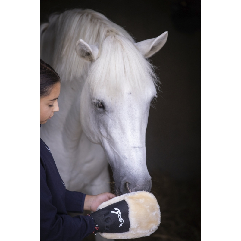 Extreme simplicity for this grooming glove, very useful to polish the dress of your horses. In synthetic sheep, it has an elastic at the wrist so that it stays in place and the logo is placed on the back of the hand. A few drops of shine spray on it and your horse will shine! Good grooming to all!