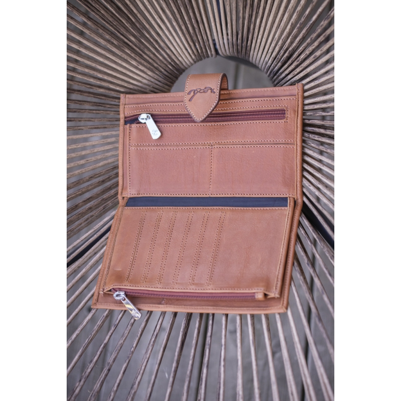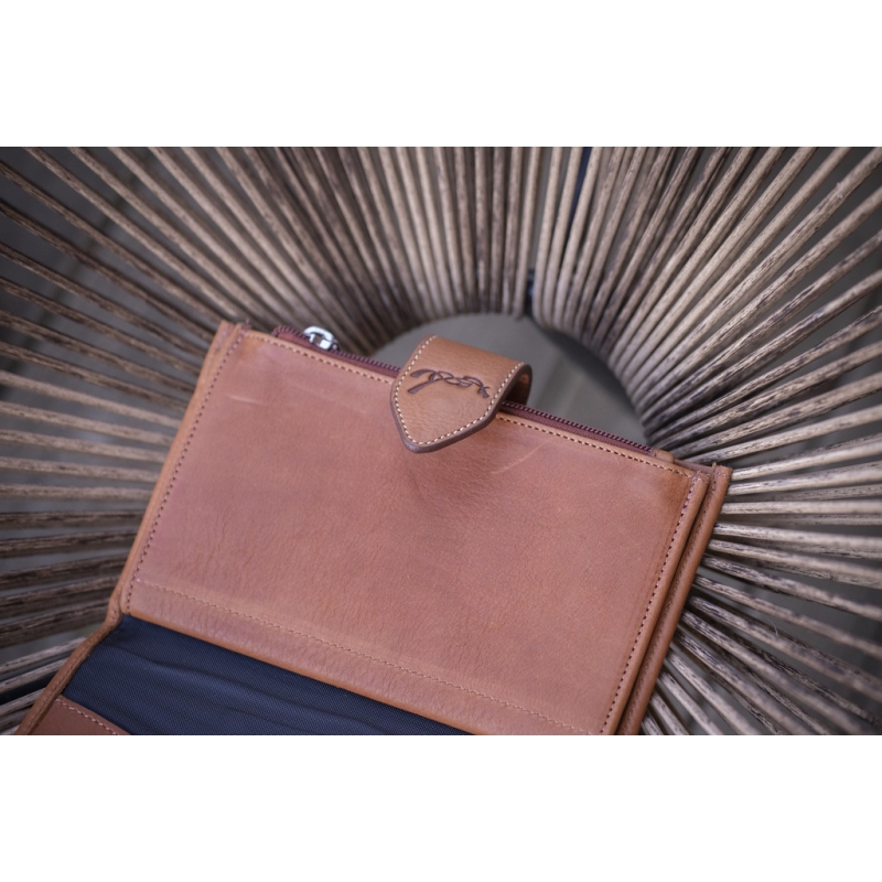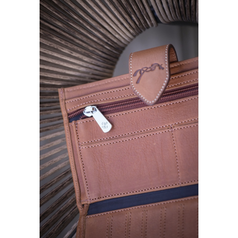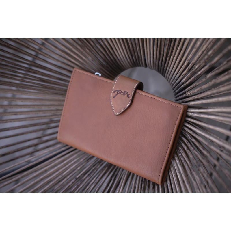 Bertille Wallet in perforated brandy leather. Ideal for carrying all your papers and means of payment with you. It consists of three sections to organize your coins, bank cards, or other cards, and your checkbook. It closes with a grained leather flap marked with the small Pénélope logo, accompanied by a snap button.