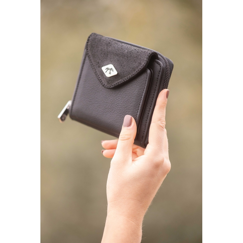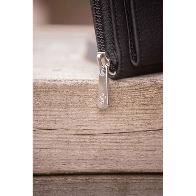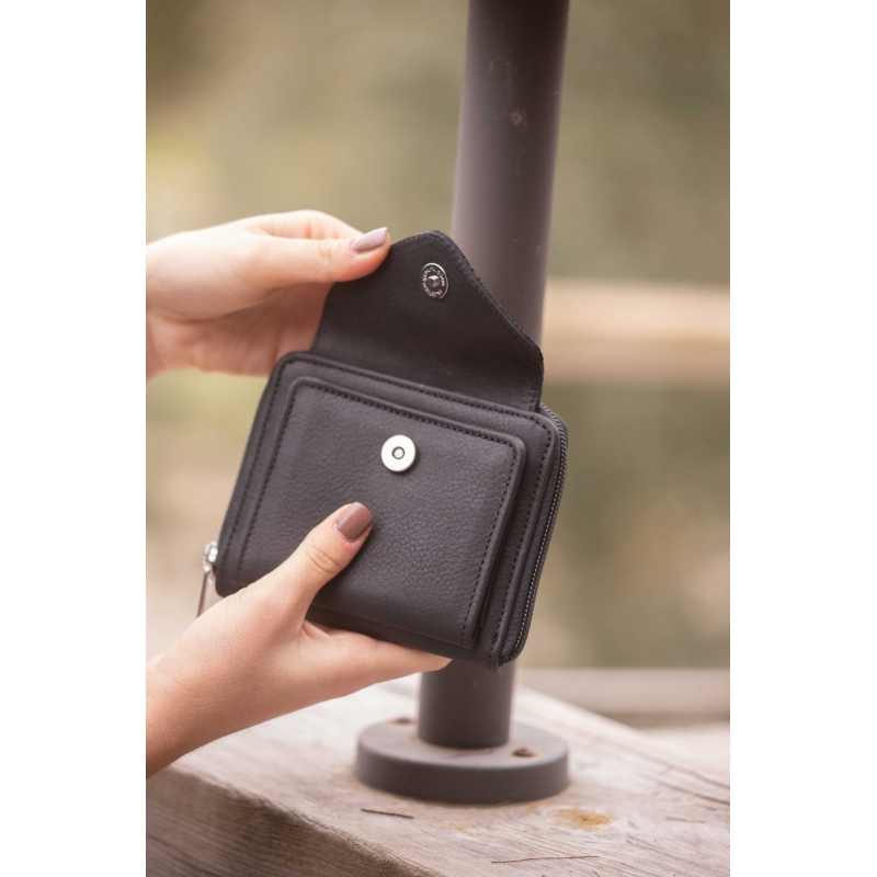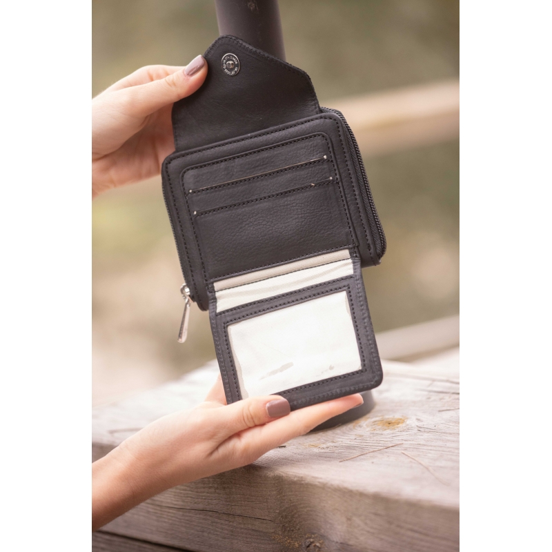 The Clémence leather wallet from the Pénélope Collections features a zippered compartment for coins with four card slots, and a second snap-closure compartment with two additional card slots and a transparent plastic window for photos or small documents. The flap of this compartment is made from glitter leather.
