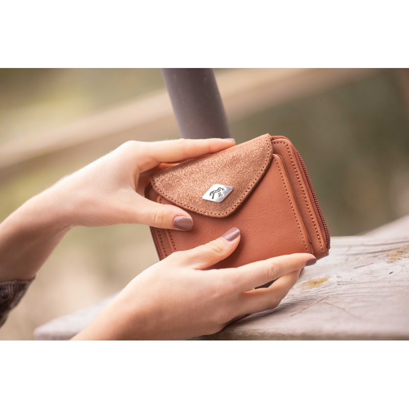 The Clémence leather wallet from the Pénélope Collections features a zippered compartment for coins with four card slots, and a second snap-closure compartment with three additional card slots and a transparent plastic window for photos or small documents. The flap of this compartment is made from glitter leather.