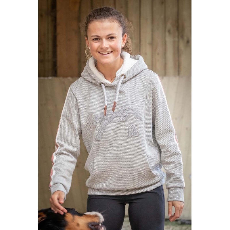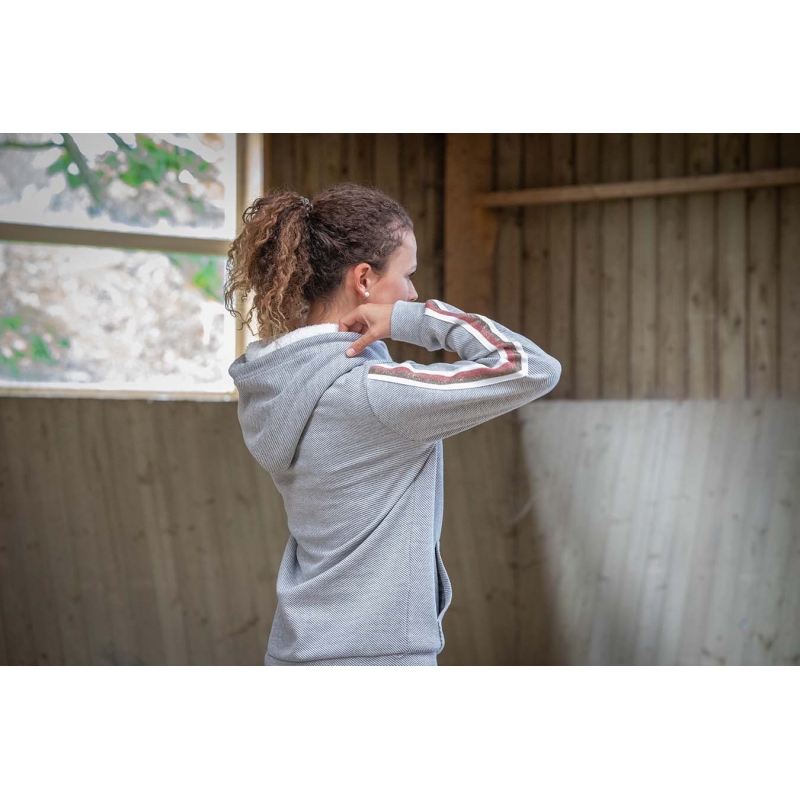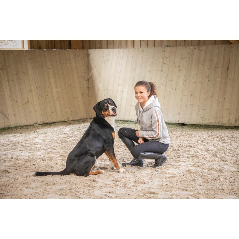 A hoodie as we like them in our Collections ! Not too warm, not too light, just the right amount of originality. Our Kathya hoodie has a front pocket and a hood lined in ultra-soft white fleece. It adjusts with shiny cords with fake leather inserts at the ends, very elegant. On each sleeve, a wide and glittering braid composed of bands, draws the arm and brings a feminine touch. The Penelope logo is embroidered tone on tone on the chest in a soft and glittery fabric. With a slightly large cut, the Kathya hoodie can be worn easily in town or at the stables.