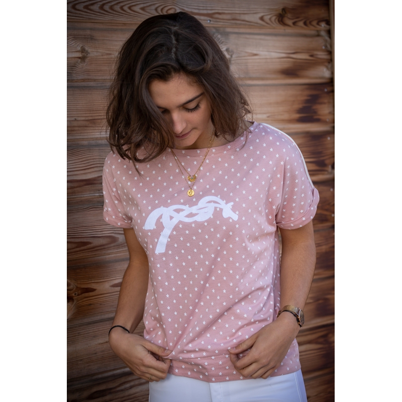 Poppy t shirt is back for Spring/ Summer 2022 collection, and it still has this fit we all love : not too loose, not too fit, it will fit every body type! Made in a pink fabric with white stars on it, it has short sleeves without any stitches. On the shoulders and sleeves, a thin white piping. On the front, Pénélope logo is in white velvet, matching the shoulder piping. To be worn over a pair of jeans or a pair of breeches, it will look great on both.