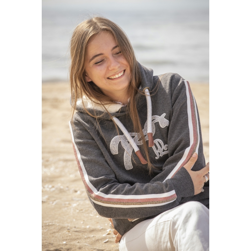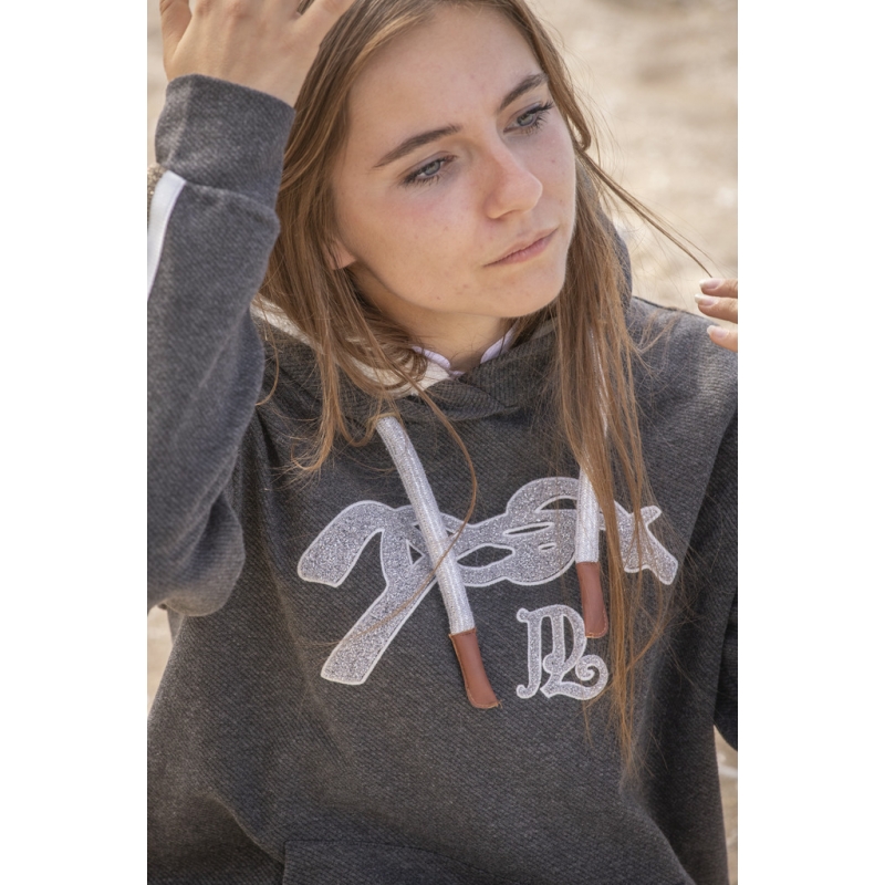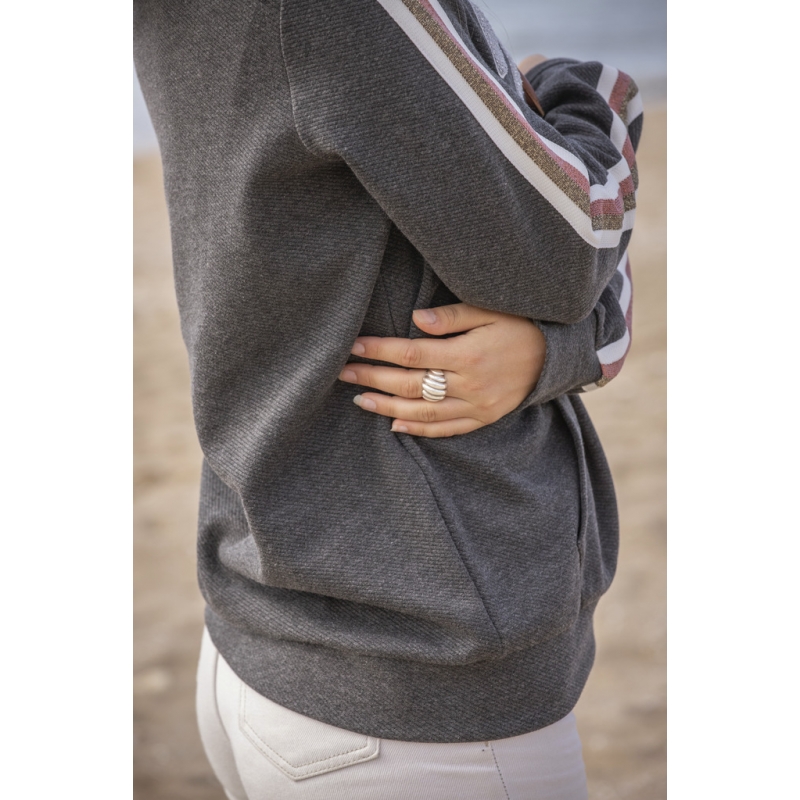 Kathya Pénélope dark grey hoodie. Pénélope logo on the front in light grey with glitter, large front pocket. The fabric of the sweatshirt is made with alternating dark and light grey stripes. There is a tricolour white/gold pink/white stripe on each arm. The hood is lined in white fleece and has shiny tightening cords with fake leather inserts at the ends.