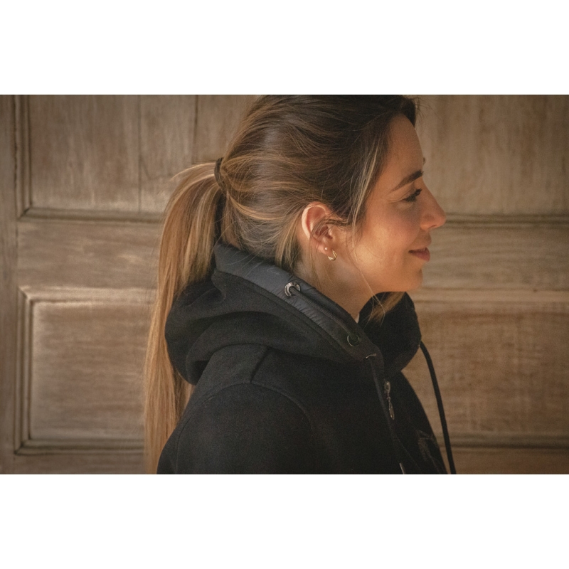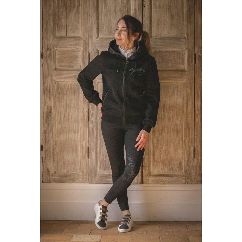 Our black Fluore sweatshirt has a zip on the front and a rhinestone Penelope logo on the heart. It has a two-material hood from which a drawstring pulls out through two different eyelets. The Fluore sweatshirt has two zipped front pockets. It's a sportswear piece that's as easy to wear at the stables as it is in town.
