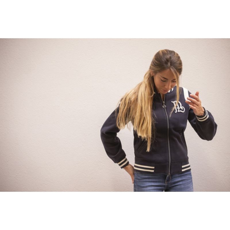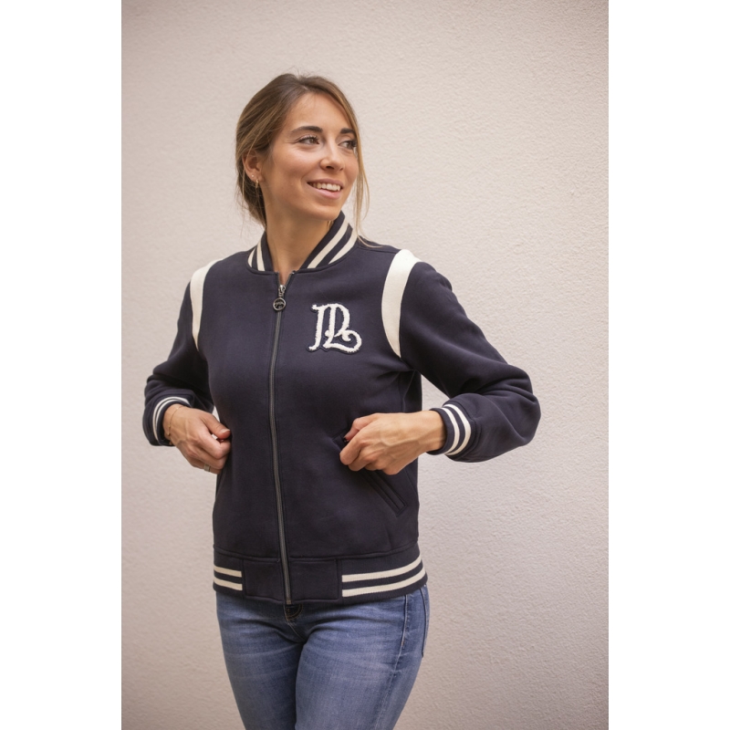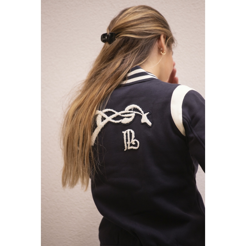 Pénélope "University" Sweatshirt, designed like a teddy with its recognizable details: white inserts at the top of the sleeves, a flat collar, and striped cuffs and hem, as well as Pénélope embroidery in looped bouclé on the heart and on the back. It closes with a lovely zipper and can be worn both with breeches at the stables and with jeans in the city.