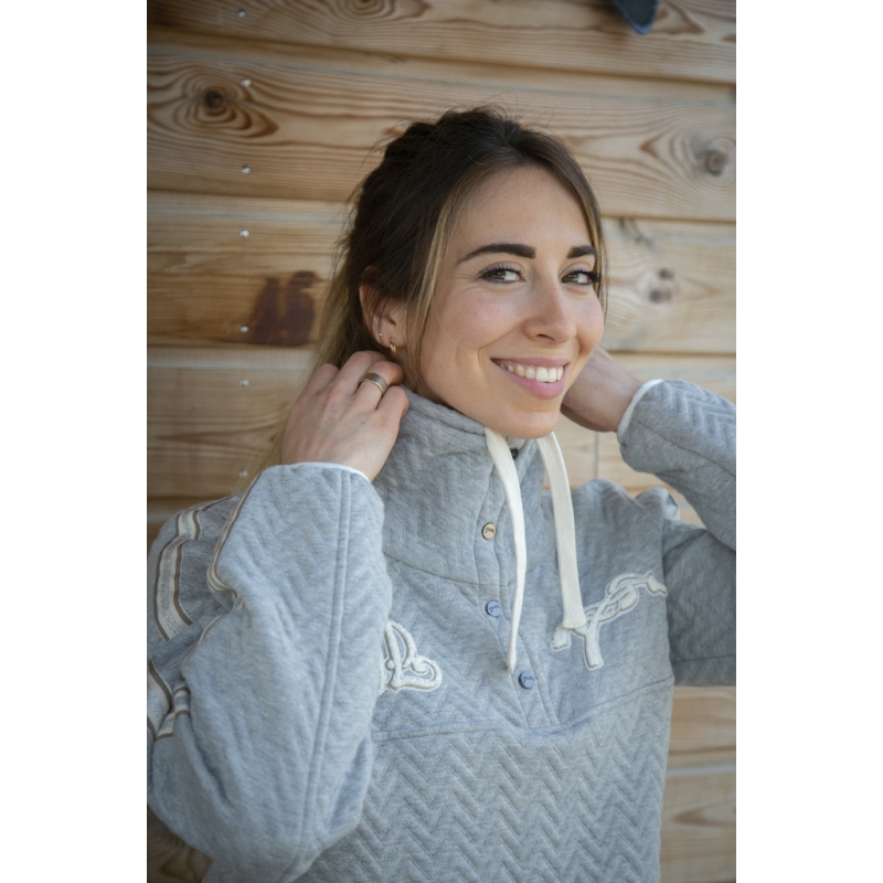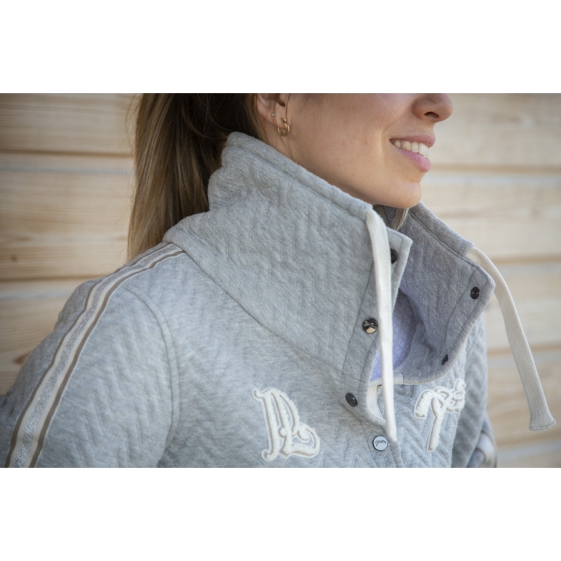 Light grey and off-white sweater with herringbone quilting to pull over the head. The high collar is fastened with a row of buttons bearing the Penelope logo and two drawstrings. On the chest, loop embroidery of the logo and of the 'PL' monogram adds to the comfy feeling of this sportswear piece. Finally, along the arms, a pretty taupe, cream and silver braid finishes off the look of the Pépita sweatshirt. It has two slit pockets on the front and an off-white braid that makes the bottom of the sweatshirt a little tighter for a fitted effect.