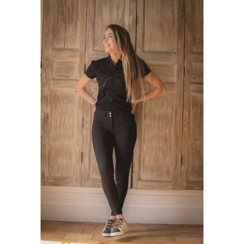 "Iliana" polo shirt with short sleeves, a V-neck extended by a small mandarin collar and 3D embroidery of the Pénélope logo enhanced by a row of rhinestones.