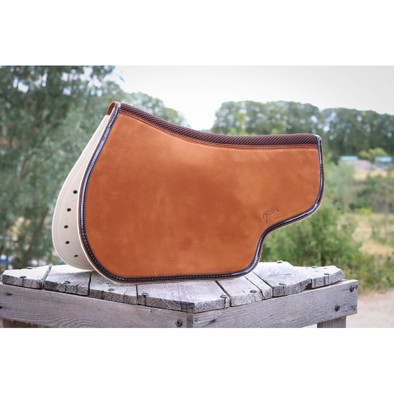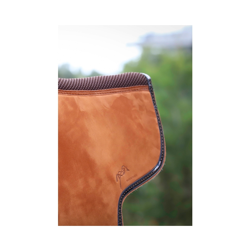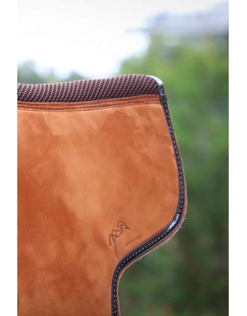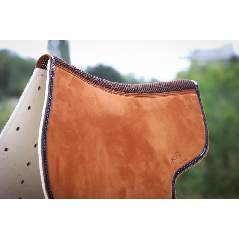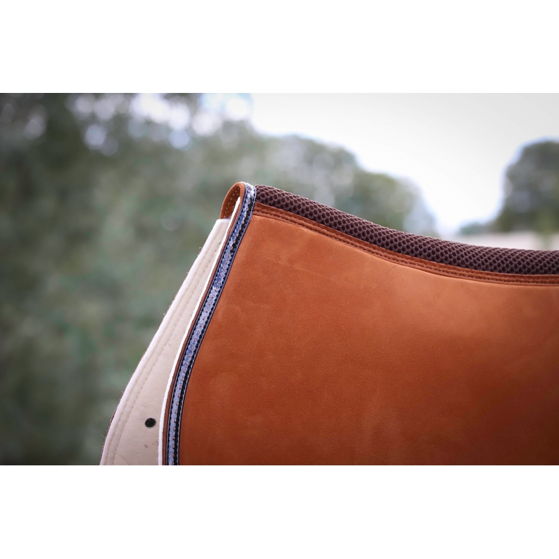 Tri material high end half pad: Felt, shock absorbing neoprene, nubuck. Brandy color on the outside. A patent Point Sellier stitches binding goes all around. A ventilated 3D Mesh strip on the top reduces the pressure on the horse spine, and is breathable. This strip makes it easier to place your pad correctly, and procures an optimum comfort to the horse. Meanwhile, the rider has very good feelings as the pad is very thin and gives close contact. The shape, without any stitches, copying the saddle shape, is very wide which gives a very good pressure distribution and an consistent shock absorption.