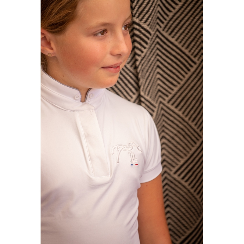 Le polo de concours Madrid Eden by Pénélope, que vous connaissez si bien en taille adulte et qui vous plait tant depuis plusieurs saisons, se décline ici en blanc. Très féminin, il a de jolies manches courtes légèrement froncées, un col qui se ferme par une pression cachée et rehaussé de deux petits boutons de chaque côté, à l'extérieur. Son col officier blanc est décoré d'un petit liseré gris argenté. Deux boutons sont visibles à l'extérieur sur chaque bord du col. Le polo de concours Madrid est en tissu respirant et décoré d'une broderie du logo en 3D et son petit drapeau tricolore.