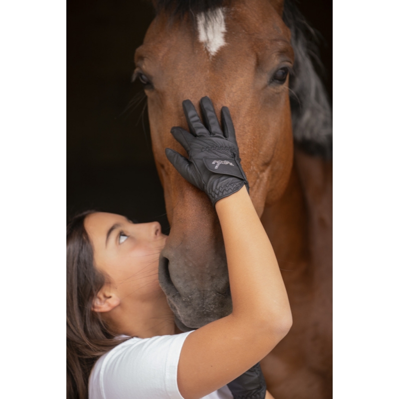 Girly les gants "Prisma" Pénélope collections ! Très confortables à porter tous les jours, ils sont fins, bien ajustés et permettent aux cavaliers de garder toute leur dextérité à cheval. La zone entre le pouce et l'index est renforcée pour une meilleure résistance dans le temps. Ils se ferment grâce à un velcro sur le dessus de la main et s'adaptent ainsi à plusieurs tailles de poignets. Sur ce velcro, on trouve le logo Pénélope en strass qui donne cette touche chic et discrète, 100% dans l'esprit Pénélope. Il peuvent s'utiliser à la fois quotidiennement aux écuries mais aussi en compétition.