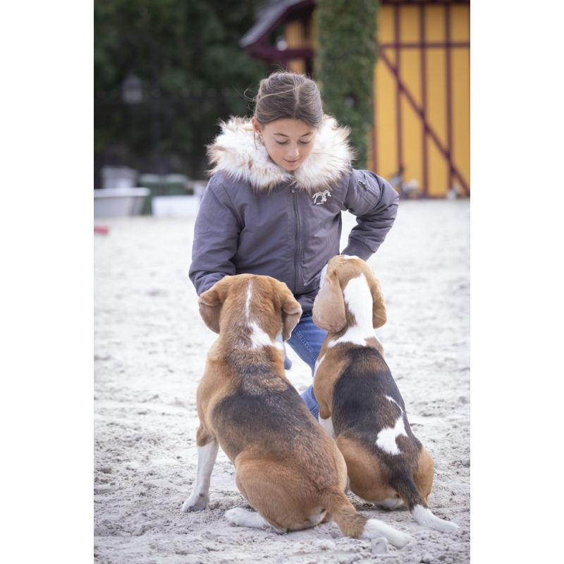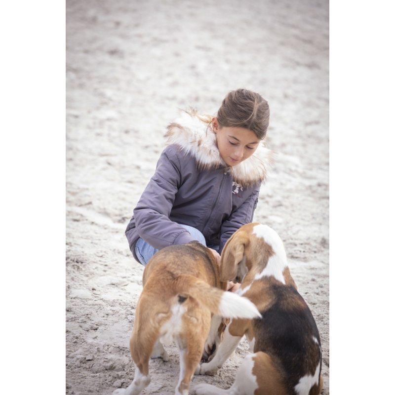 C'est un blouson type bombers très chaud qui est doublé d'une polaire ultra douce. Il doté d'une bande élastique sur le bas du blouson et les poignets pour limiter les entrées d'air froid. Il a une fermeture éclair centrale et deux poches boutonnées sur le devant. Une poche supplémentaire est située sur la manche gauche. La capuche est intégrée et entourée d'une belle et épaisse fausse fourrure. Ce blouson est déperlant mais pas imperméable.