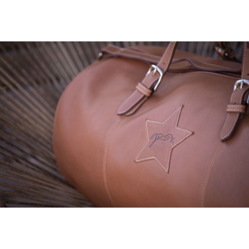 Sac bagage "Bowl" Pénélope forme bowling en cuir haut de gamme. Il est doté de deux anses rehaussées d'un rang de perles multicolores dans les tons turquoises. Au centre, on trouve un insert en cuir en forme d'étoile avec le logo Pénélope embossé. Il est également doté d'une bandoulière qui s'attache et se détache grâce à deux mousquetons argentés. Le sac se ferme grâce à un zip argenté sur le dessus. A l'intérieur, on trouve une doublure crème et une poche zippée.