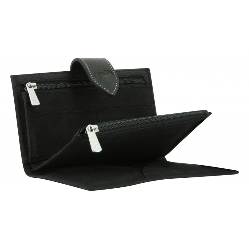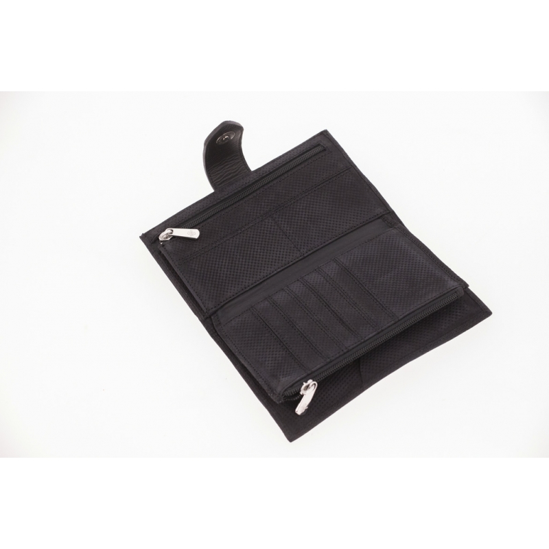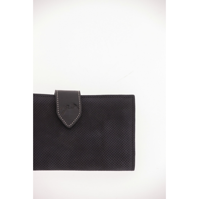 Portefeuille Bertille en cuir micro-perforé noir. Idéal pour emmener tous vos papiers et moyens de paiements avec vous. Il est composé de trois volets permettant de ranger votre monnaie, vos cartes bancaires ou autres cartes et votre carnet de chèques. Il se ferme grâce à une patte en cuir grainé marquée du petit logo Pénélope accompagnée d'un bouton pression.