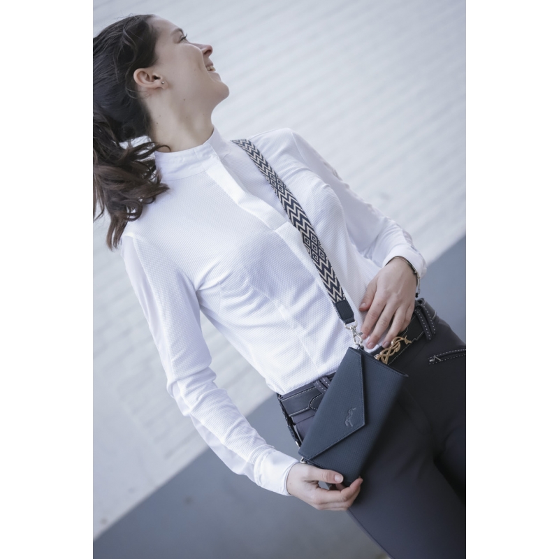 Pochette pour téléphone en cuir perforé à accrocher sur la ceinture ou à porter en bandoulière. Ultra pratique pour emporter son téléphone portable partout avec soi, elle s'accroche à la ceinture grâce à un système de pattes avec des pressions ou se porte en bandoulière grâce à une jolie lanière large et plate aux motifs chevrons. Elle se ferme à l'avant, grâce à un bouton pression placé sous un rabat en V embossé du logo Pénélope. Sur ce rabat, un passepoil pailleté assorti vient rehausser sa forme en V.