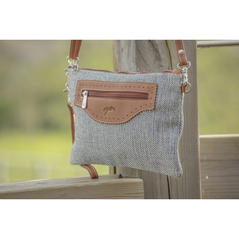 Pochette Nina des Collections Pénélope confectionnée dans un tissu type Canvas qui se ferme par un zip sur le dessus. À l'extérieur de la pochette, une poche zippée est surmontée d'une jolie pièce en cuir cognac sur laquelle le logo Pénélope est embossé. Cette pochette est idéale pour emmener avec soi tout le petit nécessaire du quotidien. Elle se porte en bandoulière ou à l'épaule grâce à une lanière réglable. Pour une utilisation encore plus chic, la bandoulière en cuir cognac se détache et la pochette Nina se porte alors, tout naturellement, à la main. Avec sa poche zippée à l'intérieur, la pochette Nina peut élégamment recevoir tout élément habituellement en vrac dans un sac de grande contenance.