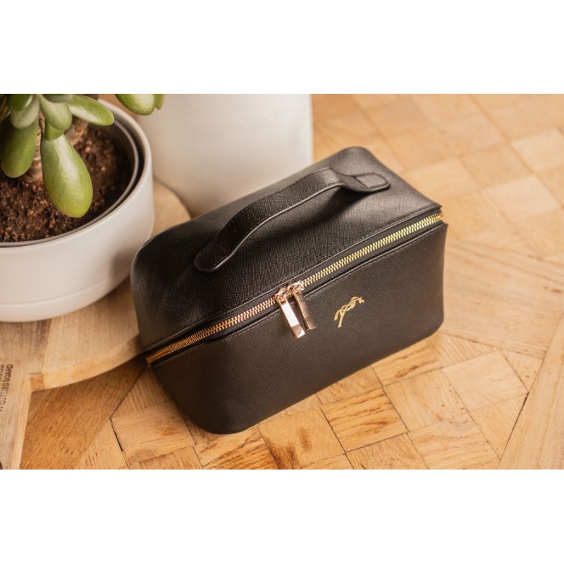 Jolie trousse de toilette pour emporter tous vos essentiels de beauté en voyage. Elle peut recevoir de nombreux petits indispensables : maquillage, crèmes, soins et autres accessoires. Elle mesure 25 cm de long sur 12 cm de large et 14 cm de haut. Elle se ferme par un zip qui permet de l'ouvrir en grand, pour tout retrouver avec la plus grande facilité. Une petite pochette intérieure zippée complète les capacités de rangement. Le logo Pénélope est marqué en doré sur la face externe.