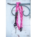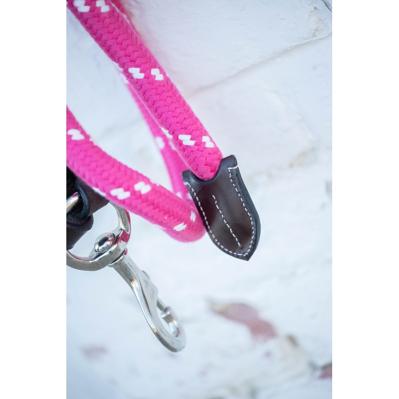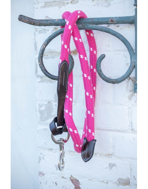Une longe pour les filles, pour les cavalières addict au rose qui flash! Voici la longe Pénélope rose composée d'une large corde rose et blanche bien épaisse qui tient bien dans la main. Elle est reliée au mousqueton en acier inoxydable par une pièce de cuir noir ou marron selon le modèle. Le cuir est épais mais souple puisqu'il s'attache au mousqueton par un nœud coulissant. A l'autre extrémité, au bout inférieur de la longe, on trouve un embout en cuir cousu sur la longe qui lui donne un chic supplémentaire. La longe des Collections Pénélope s'associe à un licol pour déplacer son cheval une fois sorti du box ou pour le mettre à l'attache, pour le transport etc