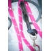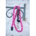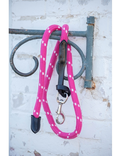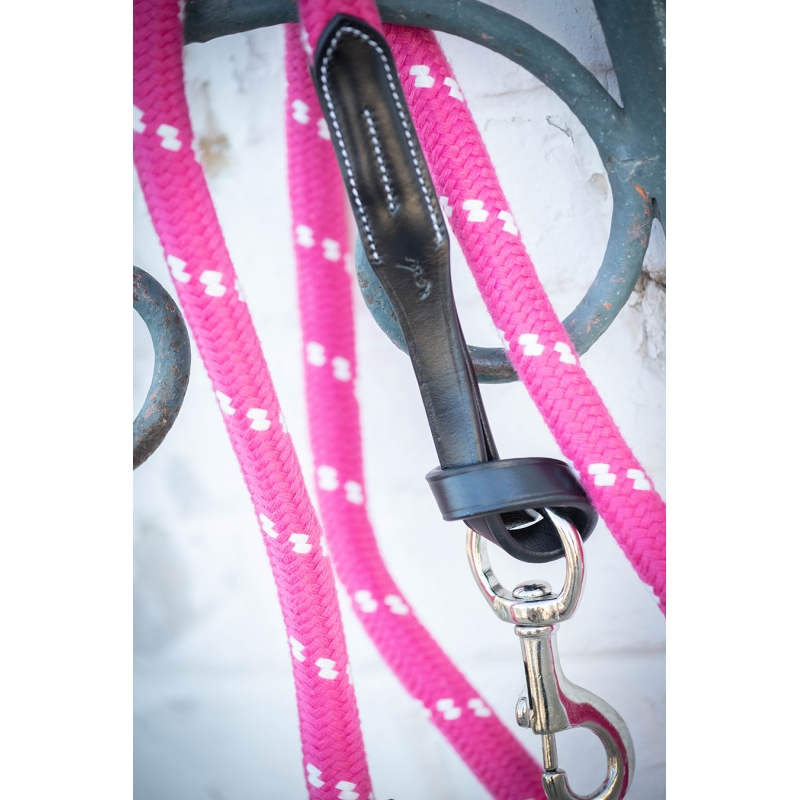 Une longe pour les filles, pour les cavalières addict au rose qui flash! Voici la longe Pénélope rose composée d'une large corde rose et blanche bien épaisse qui tient bien dans la main. Elle est reliée au mousqueton en acier inoxydable par une pièce de cuir noir ou marron selon le modèle. Le cuir est épais mais souple puisqu'il s'attache au mousqueton par un nœud coulissant. A l'autre extrémité, au bout inférieur de la longe, on trouve un embout en cuir cousu sur la longe qui lui donne un chic supplémentaire. La longe des Collections Pénélope s'associe à un licol pour déplacer son cheval une fois sorti du box ou pour le mettre à l'attache, pour le transport etc
