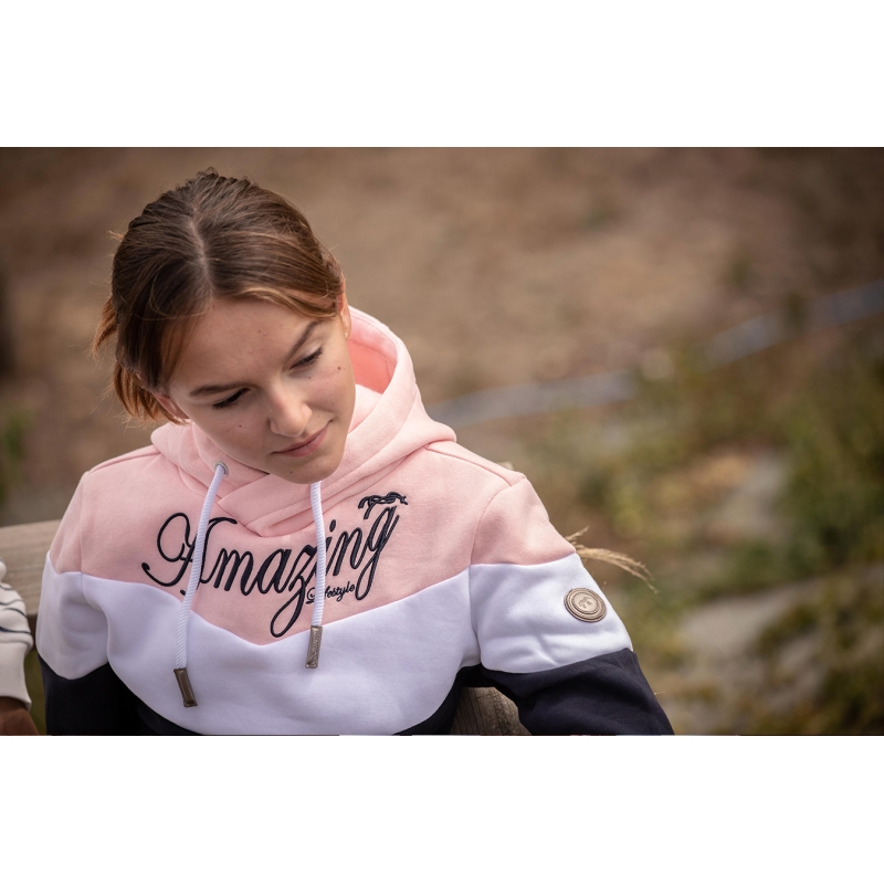 Le sweat-shirt "Artémis" est une création 100% Pénélope pour la saison 2022. On aime son effet colorblock en rose, blanc et marine. Il est décoré d'une grande broderie "Amazing" en arrondi sur le devant. Il est doté d'une bande élastique sur les poignets et sur le bas pour limiter les entrées d'air froid. Sa belle capuche s'ajuste avec deux cordons de serrage. Sur le devant il possède une grande poche centrale pour plus de confort. Derrière la capuche, le petit logo Pénélope est brodé au centre.