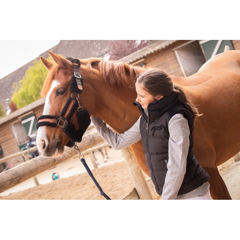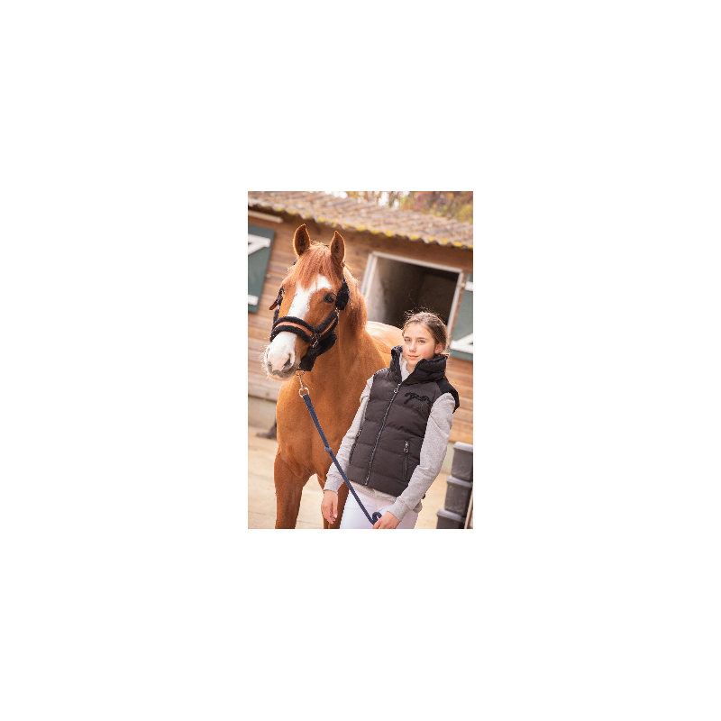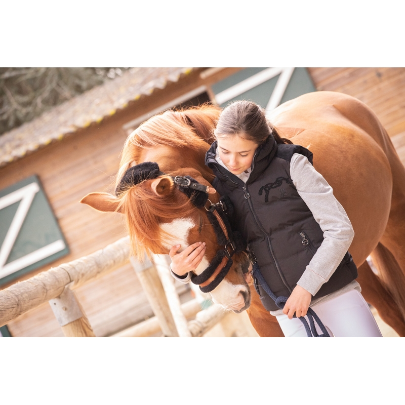 Elle est confectionnée dans un tissu stretch sur lequel des empiècements en velours s'intègrent parfaitement et lui apporte cette touche de féminité qui s'emporte aux écuries comme en ville.