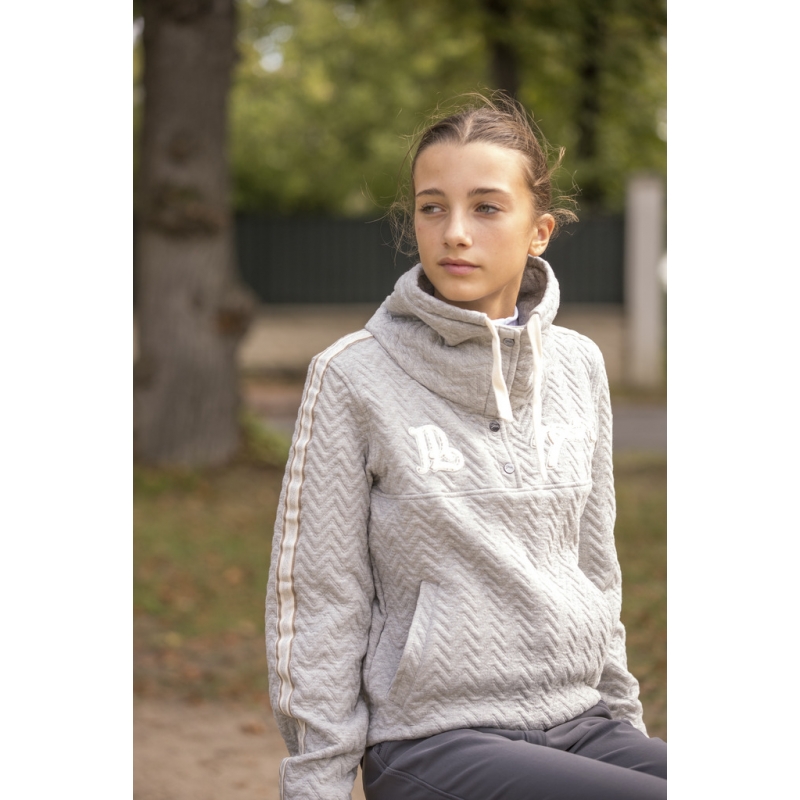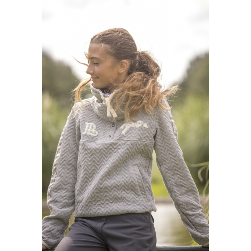 Sweat-shirt gris clair et écru finement matelassé en chevrons à enfiler par la tête. Le col montant se ferme par une rangée de boutons logoté Pénélope d'où sortent deux cordons. Sur la poitrine, les broderies en bouclettes du logo et du monogramme PL se rajoutent à l'esprit très "comfy" de cette pièce sportswear. Enfin, le long des bras, un très joli galon taupe, crème et argenté finissent le look du sweat Pépita. Il a deux poches en fentes sur le devant et un galon écru qui resserre un peu le bas du sweat.