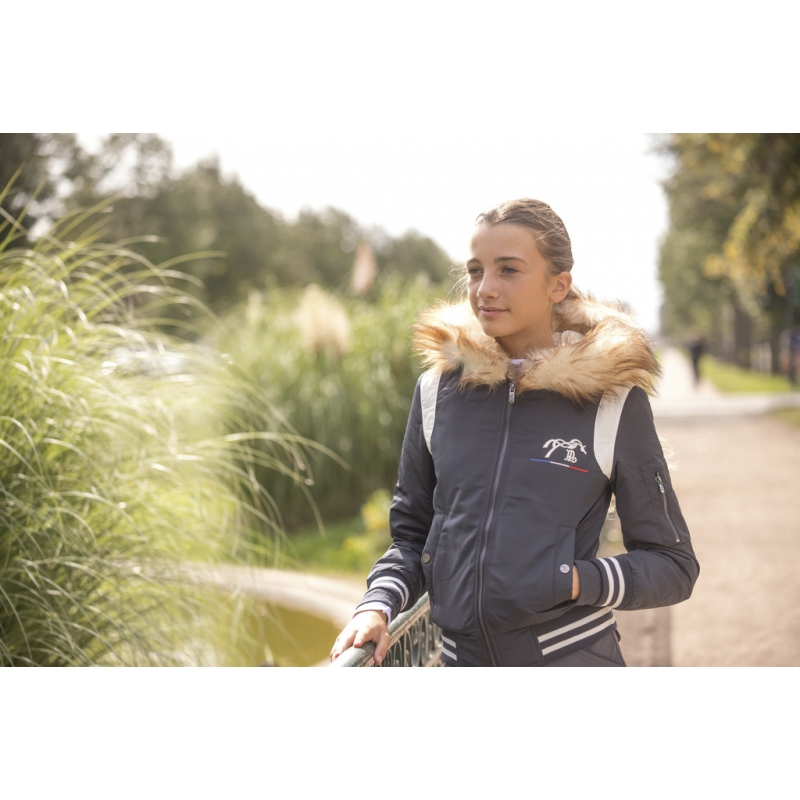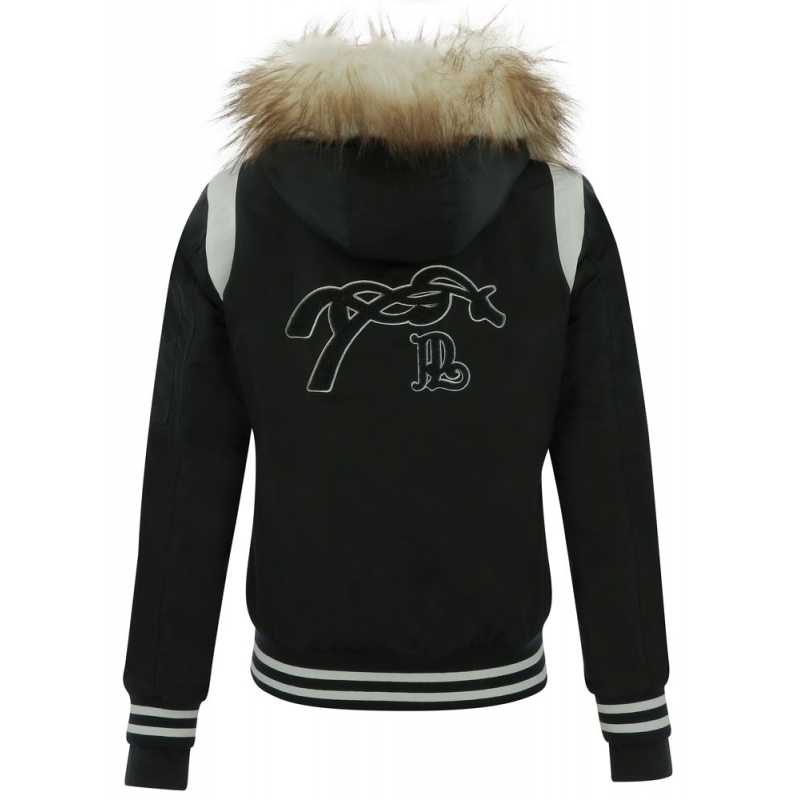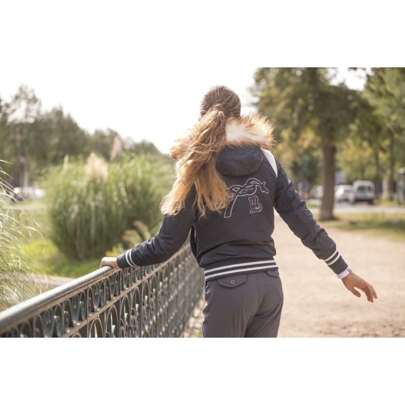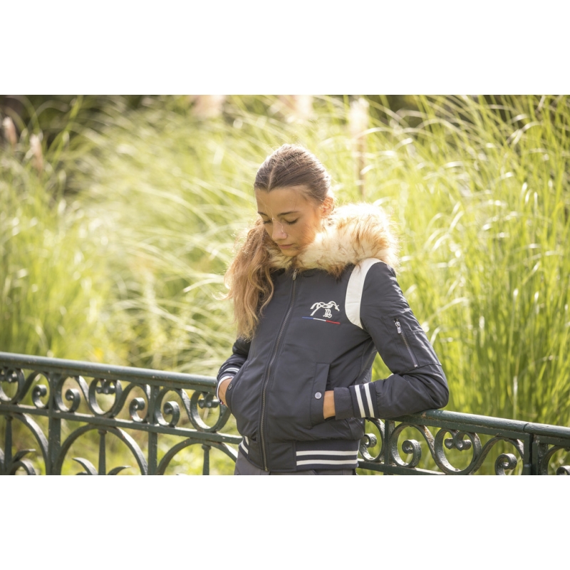 Ce petit bombers Lyon, star des collections Pénélope allie mode et confort avec sa coupe courte sur la taille. Il a une fermeture éclair sur le devant et une capuche non-amovible avec une véritable fausse fourrure. Deux poches boutonnées sont placées de chaque côté. Il est doté d'une poche zippée sur le bras gauche. Sur cette nouvelle version, deux bandes écrues au niveau des épaules ont été rajoutées et des rayures viennent habiller le tour des élastiques au niveau de la taille et des poignets.