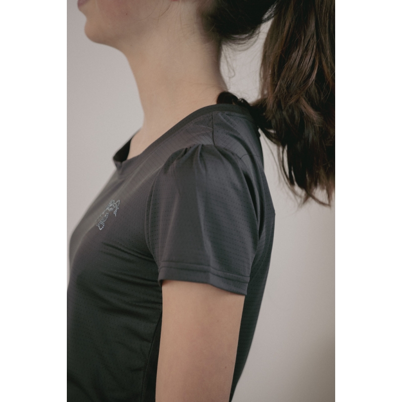 T-shirt "Techty" technique confectionné dans un tissu micro-aéré respirant et ultraléger, spécifiquement étudié pour la pratique des sports équestres ou autres sports. Il possède des manches courtes surmontées de petites fronces aux épaules. Il a un col rond joliment dessiné et un marquage du logo Pénélope en strass sur le cœur.