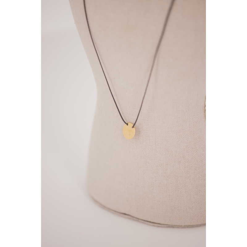 Collier composé d'un fin cordon noir et d'une petite plaque ronde sur laquelle est marqué le logo Pénélope.